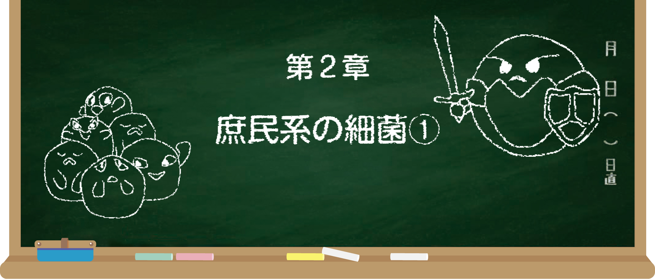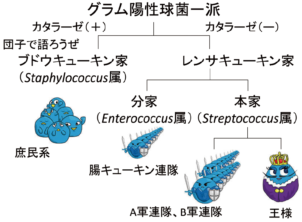 ブドウ球菌の属名(Staphylococcus)は、「ブドウの房状の」という意味の“staphylo-”と「球菌」を意味する“-coccus”を合成したものです。また、黄色ブドウ球菌の種名の“aureus”は「黄金」という意味で、金の元素記号Auと同じ語源です。なお、レンサ球菌系は、本家(Streptococcus属)と分家(Enterococcus属)に分かれ、本家はさらに、王様である肺炎球菌(Streptococcus pneumoniae)と、A軍、B軍などの連隊である溶血性レンサ球菌(A群はStreptococcus pyogenes、B群はStreptococcus agalactiae)などに分かれます。