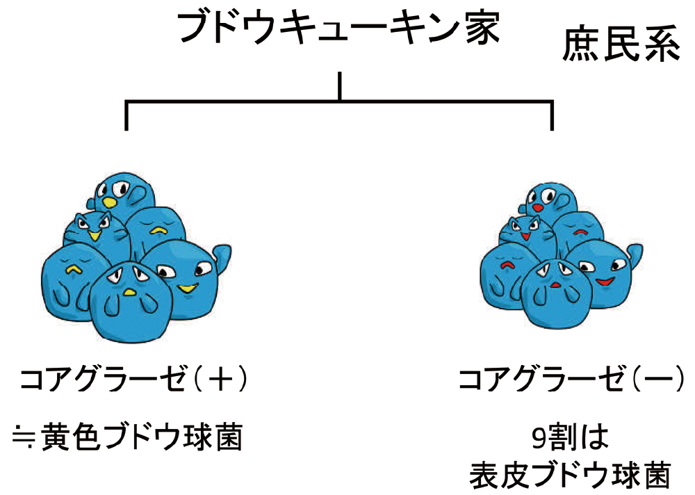 最初に、細菌学的な特徴を理解するために、グラム陽性球菌の臨床検査上の分類を家系図風に説明したいと思います。まず、グラム陽性球菌一派は、ブドウ球菌系(cluster)とレンサ球菌系(chain)に分かれます。ブドウ球菌系とレンサ球菌系は、形状のみならず、カタラーゼという酵素でも分類することができます。団子のように固まって「みんなで語ろうぜ」ということで、カタラーゼを持っている方がブドウ球菌系、持っていない方がレンサ球菌系です(図1)。カタラーゼは、菌にとって有害な活性酸素の1つである過酸化水素(H2O2)を、水(H2O)と酸素(O2)に分解して無毒化する酵素です。爪楊枝の先に菌をとり、過酸化水素水につけて確かめます。ブドウ球菌の場合には、酸素の泡が出てきます。カタラーゼだけに「ブツブツ」と語っているようですね。