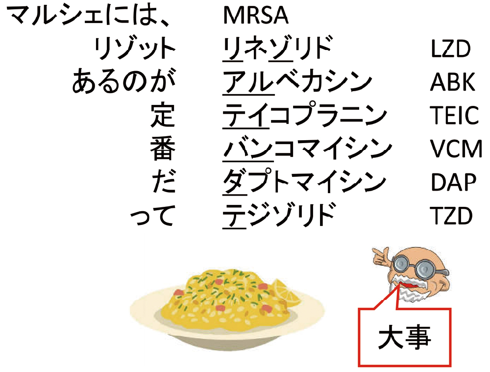 日本ではメチシリンが使用できないため、メチシリン感受性黄色ブドウ球菌(methicillin-susceptibleStaphylococcus aureus, MSSA)に対してはセファゾリンなどの第一世代セファロスポリンが使用されます。一方、MRSAに対しては、2023年現在、4系統、6種類の抗菌薬があり、抗MRSA薬という括りで分類されます。特定抗菌薬の一種です。バンコマイシン、テイコプラニン、アルベカシン、リネゾリド、テジゾリド、ダプトマイシンがあります。6つもあって覚えにくいと思いますので、覚え方をご紹介します。「マルシェ(MRSA)には、リゾット(リネゾリド)あるのが(アルベカシン)定番(テイコプラニン・バンコマイシン)だって(ダプトマイシン・テジゾリド)」。いかがでしょうか(図4)。