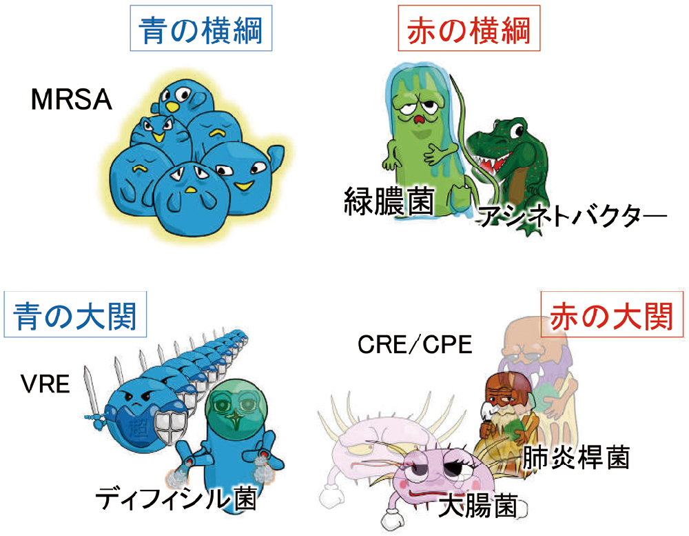 グラム陽性菌を青、グラム陰性菌を赤として、代表的な耐性菌を青と赤の横綱と大関に位置付けてみました。