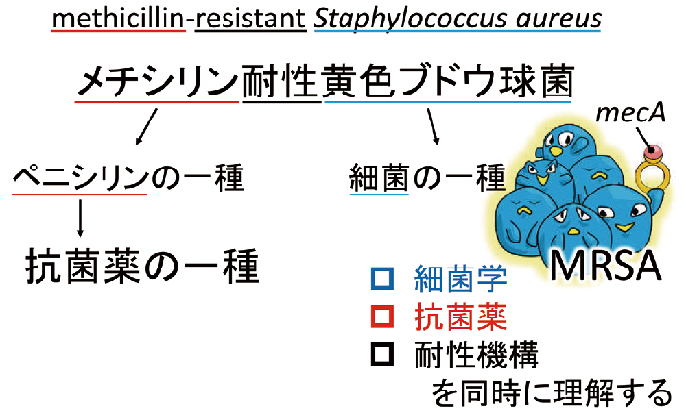 MRSAは、日本で最も多い耐性菌として、臨床的に重要であるばかりではなく、細菌学、抗菌薬、耐性機構を同時に学ぶ題材としても最適です(図6)。私の中では、元祖耐性菌のイメージです(表1)。
