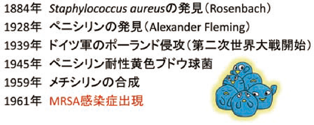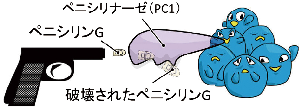 最初は黄色ブドウ球菌にもペニシリンGが効いていましたが、ペニシリンが使用されて間もなく、PC1というペニシリナーゼ(ペニシリン分解酵素)をゲットし、ペニシリンが効かなくなりました。