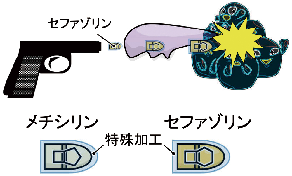 ペニシリナーゼで破壊されないよう特殊加工されたペニシリナーゼ耐性のペニシリンがメチシリンです。ただし、メチシリンは、日本では使えないため、メチシリンの代わりに、第一世代セファロスポリン系薬のセファゾリンを使っています。