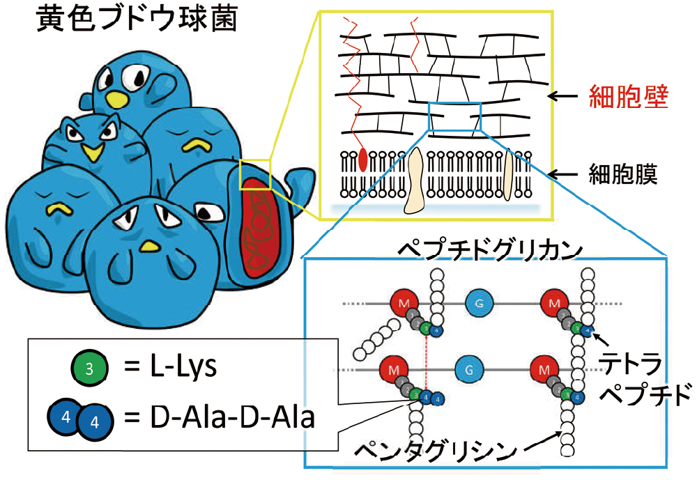 細胞壁は黄色ブドウ球菌の10気圧という細胞内圧に耐えうるために、強靭な網目構造となっています。横糸、縦糸に例えると、横糸はGとMの繰り返し構造となっています。Mから4種類(L-Ala、γ-D-Gln、L-Lys、D-Ala)のアミノ酸残基からなるテトラペプチドが側鎖として出ており、1つの横糸にあるL-Lysと別の横糸にあるD-Alaの間に、ペンタグリシンという縦糸が入ります。縦糸が入る前は、テトラペプチドの先端にもう一つD-Alaがついていますが、この末端のD-Alaが取り除かれることで、テトラペプチドになり、ペンタグリシンによる橋渡し(架橋)が可能になります。