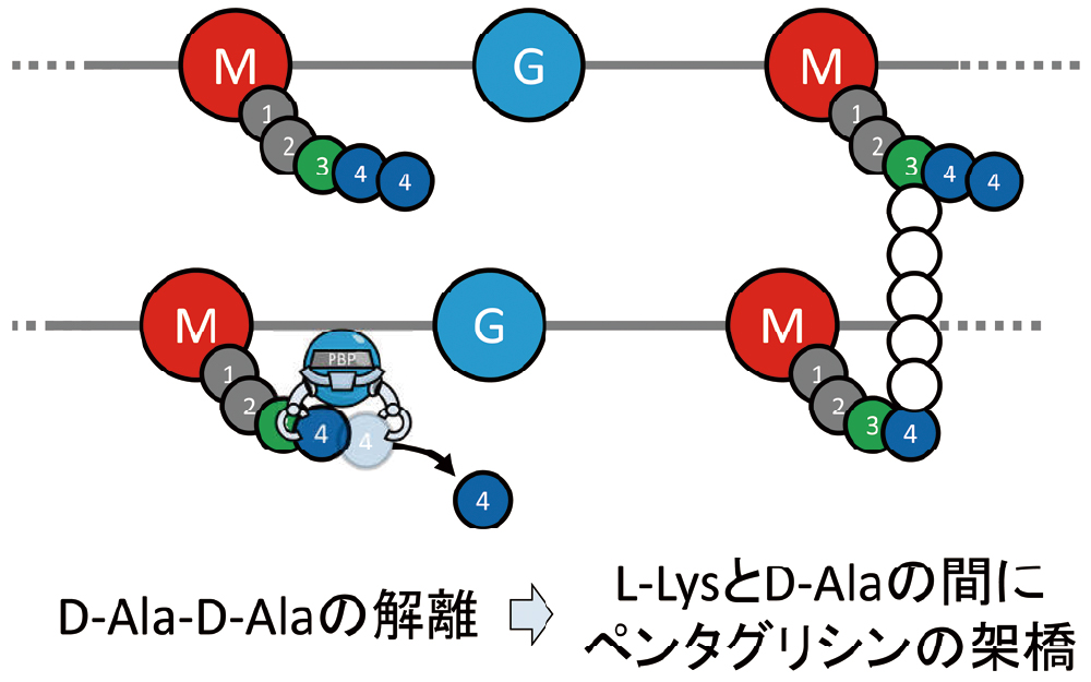 PBPが、D-Ala-D-Alaを解離させることで、末端のD-Alaがとれて、L-LysとD-Alaの間にペンタグリシンの架橋ができます。