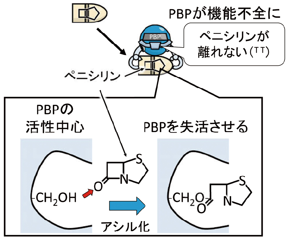 PBPの活性中心では、本来、D-Ala-D-Alaの解離が行われますが、ペニシリンがPBPの活性中心に結合(アシル化)するため、PBPが失活します。一度結合したペニシリンは、すっぽんのように結合し、離れません。
