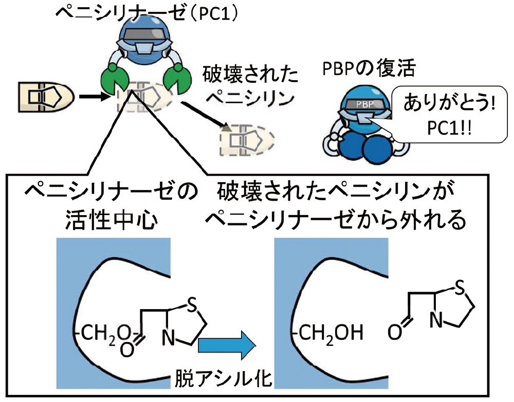 ペニシリナーゼの活性中心は、PBPに似ているので、PBPになりすまして、ペニシリンを破壊します。PBPの場合には、ペニシリンがくっついたままでしたが、ペニシリナーゼは、ペニシリンを「骨抜き」にした後、ペニシリンを解放します(脱アシル化)。そのため、ペニシリナーゼは、次々にペニシリンを破壊し続けることができ、そのおかげで、PBPは本来の機能を果たすことができます。