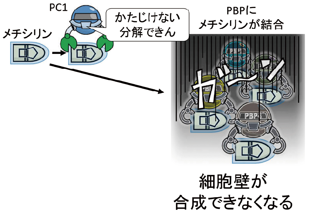 メチシリンは、ペニシリナーゼで分解できないように特殊加工されていますので、PC1では分解されません。黄色ブドウ球菌がもつ4種類のPBP(PBP1~4)には、メチシリンが結合し、細胞壁の合成ができなくなります。