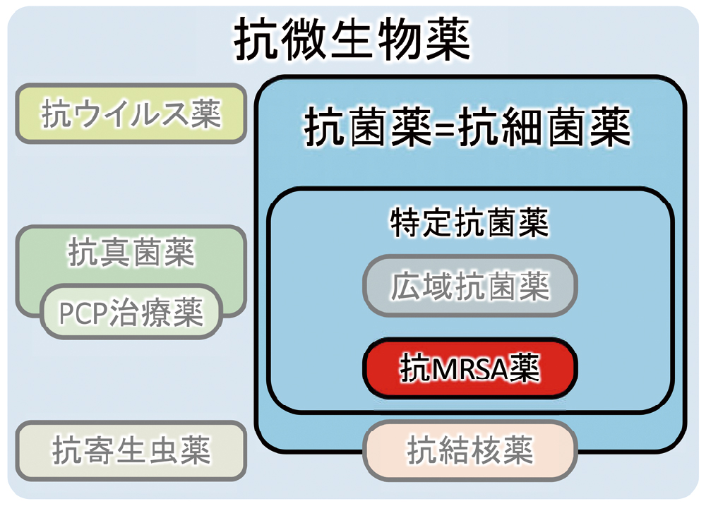 抗MRSA薬は、抗菌薬の中の特定抗菌薬の一部です。