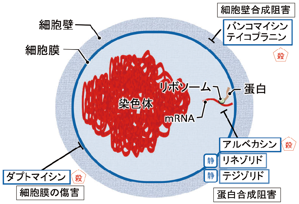 バンコマイシンとテイコプラニンは細胞壁合成阻害、ダプトマイシンは細胞膜の傷害、それ以外は蛋白合成阻害です。