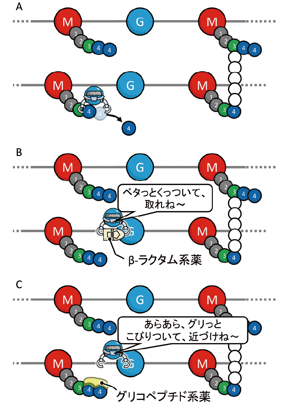 A 抗菌薬がない状態~PBPはD-Ala-D-Alaを解離させ、L-LysとD-Alaの間にペンタグリシンの架橋を行います。Bβ-ラクタム系薬は、PBPに結合して、PBPとD-Ala-D-Alaの結合を阻害します。C グリコペプチド系薬は、D-Ala-D-Alaに結合してPBPとD-Ala-D-Alaの結合を阻害します。