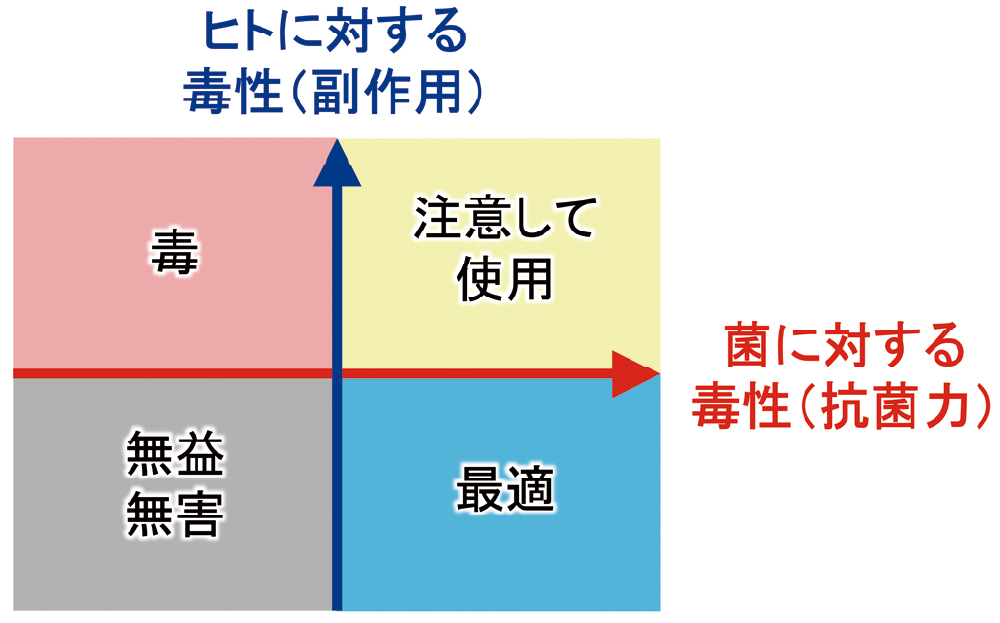 概念としては、「選択毒性=菌に対する毒性/ヒトに対する毒性」で、菌に対する毒性が高いほど、また、ヒトに対する毒性が低いほど、選択毒性は高くなります。