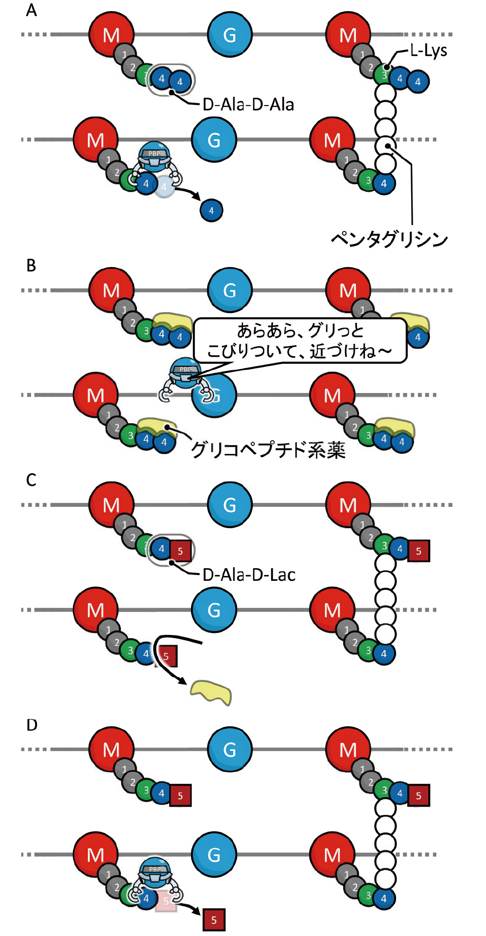 細胞壁の主成分であるペプチドグリカンの合成は、PBPが担当しています。PBPはペンタペプチドの末端のD-Alaを切り離し、L-LysとD-Alaの間にペンタグリシンの架橋を行います(図25A)。ところが、VCMなどのグリコペプチド系薬は、D-Ala-D-Alaにこびりついて、PBPの作用を邪魔します(図25B)。そこで、末端のD-AlaをD-Lac(もしくはD-Ser)に変更することで、VCMやTEICの結合を阻止します(図25C)。PBPは末端がD-Lac(もしくは-D-Ser)に変化しても、本来の機能を発揮することができるため、グリコペプチド系薬に耐性になります(図25D)。