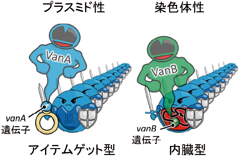 vanAは主にプラスミド性、vanBは主に染色体性です。プラスミドは受け渡しが容易なのでアイテムゲット型、染色体性の場合には元々組み込まれているので内蔵型に喩えています。ただし、染色体性のvanBも腸球菌同士で伝達されることが知られています。