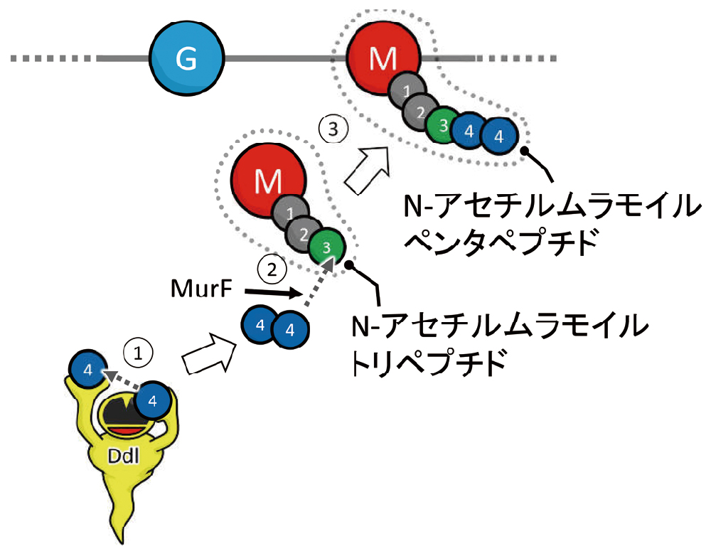 ①Ddl(D-Ala-D-Alaリガーゼ)がD-AlaとD-Alaを結合させます。②MurF(UDP-N-アセチルムラモイルトリペプチド-D-Ala-D-Alaリガーゼ)が、N-アセチルムラモイルトリペプチドにD-Ala-D-Alaを結合させます。③通常のN-アセチルムラモイルペンタペプチドが細胞壁の「横糸」に取り込まれ、バンコマイシン感受性の細胞壁の成分となります。