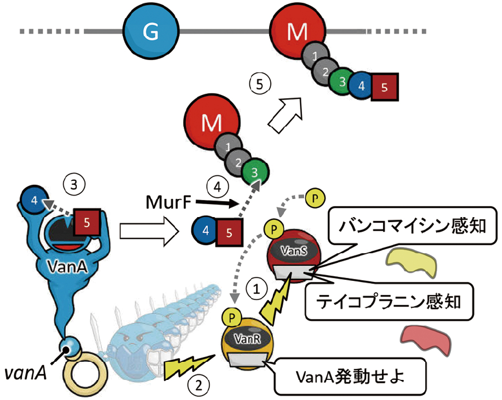 ①VanSがバンコマイシンまたはテイコプラニンを感知し、リン酸化が起こります。②VanSのリン酸基がVanRに転移することで情報が伝達され、リン酸化されたVanRがvanAを含む耐性遺伝子を誘導します。③VanAはD-AlaとD-Lacを結合させます。④MurFが、N-アセチルムラモイルトリペプチドにD-Ala-D-Lacを結合させます。⑤D-Ala-D-Lacが末端にあるN-アセチルムラモイルペンタペプチドが細胞壁の「横糸」に取り込まれるため、バンコマイシンが結合できない、バンコマイシン耐性の細胞壁の成分ができあがります。