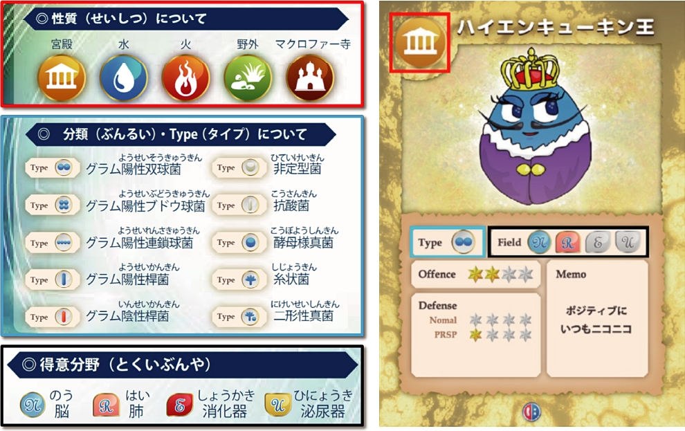 図のように菌の性質、病気を起こす臓器、学術的な分類、病原性、薬剤耐性をシンボル化したカードで、遊びながら学べる優れものです。