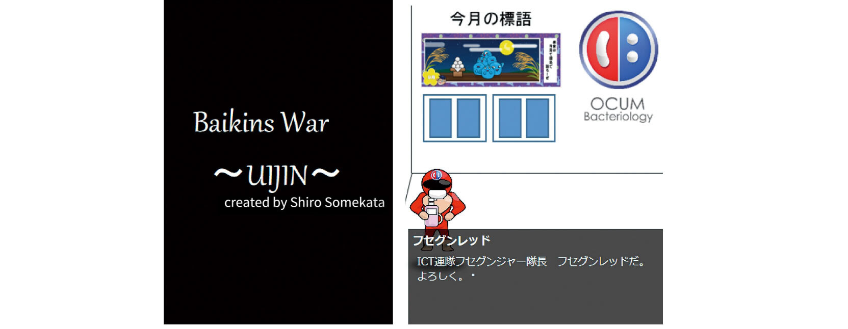 また、無料で遊べるゲームも公開しています。現在、3つほどありまして、第一作は、「Baikins War~UIJIN」です(図2)。抗菌薬の使い方を誤ると、耐性菌が出現するといった本格的なゲームです。短いストーリーですのでお気軽にお試しください。