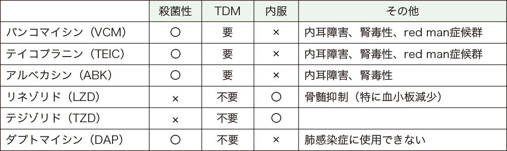 □殺菌的☆か静菌的☆か:リネゾリドとテジゾリドは静菌的、その他は殺菌的です(図17)。□投与経路:リネゾリドとテジゾリドは内服が可能、その他は静注のみ。□TDM☆が必要か: グリコペプチド系薬(バンコマイシン、テイコプラニン)とアミノ グリコシド系薬(アルベカシン)はTDMが必要です。ともに、名称に「グリコ」がついて内耳毒性、腎毒性があることも共通しています。□その他:ダプトマイシンは肺感染症に使用できません。