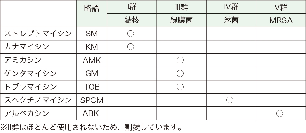 アミノグリコシド系薬*の一つです。アミノグリコシド系薬の標的はリボソームの30Sサブユニットで、蛋白の合成を阻害します。蛋白合成阻害薬は、一般に静菌的☆と言われますが、アミノグリコシド系薬は例外的に殺菌的☆です。アミノグリコシド系薬は、薬剤によってスペクトルが大きく異なるという特徴を持ち、抗MRSA薬として使用できるのはアルベカシンのみです。せっかくですので、抗MRSA薬以外のアミノグリコシド系薬についても参考のために列挙しておきます(表3)。