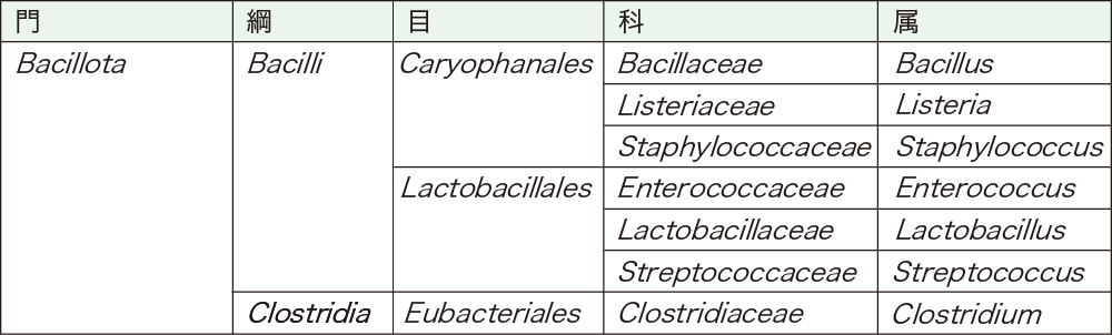 学術的な分類を眺める機会も少ないと思いますので、参考までに、ブドウ球菌がどのあたりに位置付けられるのか表にしてみました(表4)。バチルス門(Bacillota)の代表的な細菌と比較してみると、ブドウ球菌は、レンサ球菌よりもバチルス属やリステリア属に近いことが分かります。