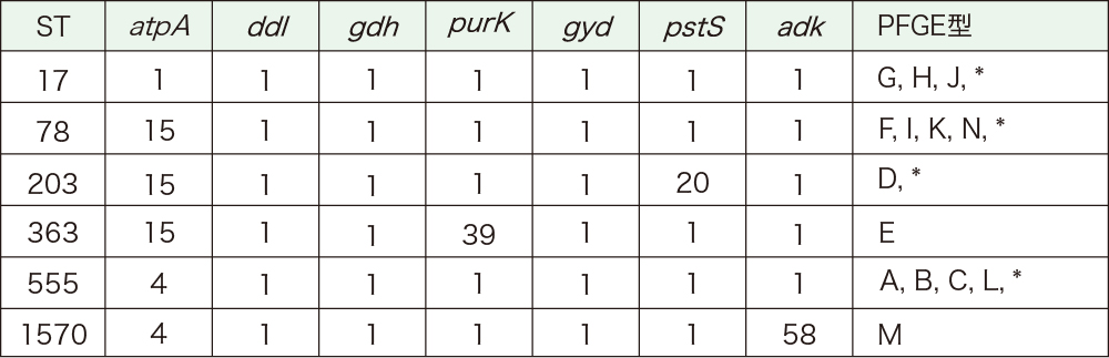 複数のクローンが知られていますが、ST17から派生したクローンが世界的に広がっていることが知られています。CC17と呼ばれる集団です。耐性機序はVanA型で、日本でもCC17による集団発生が複数報告されています。近年、複数の国で報告が増えている型は、ST1421という遺伝子型です。ST1421は、MLSTに用いる7遺伝子の1つであるpstSを欠損するという特徴を持ち、pstSnullと呼ばれています。日本では、2022年に初めてST1421の分離の報告があり、青森で地域をまたいで流行した株であることが示されています。大阪地区では、非流行地域のある施設において施設内で多クローン性の集団発生が起こったことが報告されています。本事例の株は、全てCC17に属するE.faeciumでしたが、MLSTでは6つ、PFGEでは10以上に分類されています(表6)。共通点として、vanAタイプの遺伝子群を持つ直鎖状プラスミドを保有していました。このプラスミドが、多クローン性の集団発生に寄与した可能性が示唆されます。なお、プラスミドと言えば通常は環状ですが、この報告の場合には直鎖状であった点も興味深いところです。