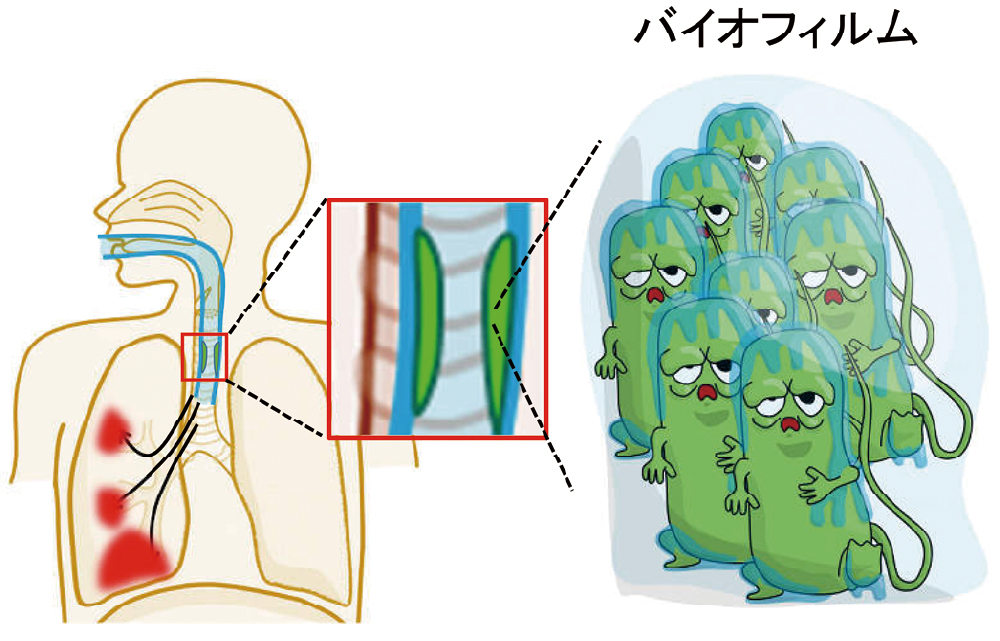 また、緑膿菌をただの「単細胞」と侮ってはいけません。緑膿菌は寄り集まって、あたかも多細胞生物であるかのようにふるまうことがあります。ただでさえ防御力の高い緑膿菌ですが、合体することでさらに強化されます。かの有名な「バイオフィルム」です(図1)。