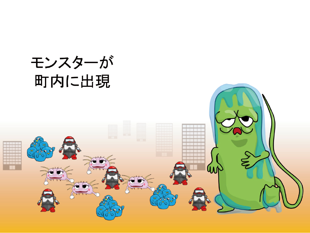 基本的には、日和見感染の病原体で、特に、抗菌薬使用中の菌交代症が典型的な感染症です。モンスター系に分類したのは、抗菌薬に抵抗性を示すということもありますが、ブドウ球菌などの庶民系に比べて「レアキャラ」である、という点も挙げられます。もし、町内にモンスターが出現したら大変な事態であることは想像に難くありませんよね(図2)。ただし、近年の医療の高度化等によって、レアキャラの出現が増えてきていることが問題になっています。ゲームでは珍しいともてはやされますが、こちらは登場してほしくないレアキャラです。