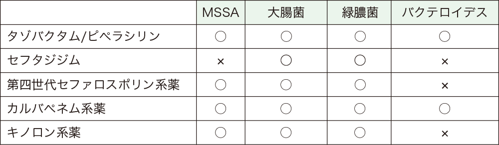 また、近年、タゾバクタム/セフトロザンという世代に分類されないセフェム系薬が登場しました。さらに、多剤耐性を示す場合には、コリスチンも考慮します。