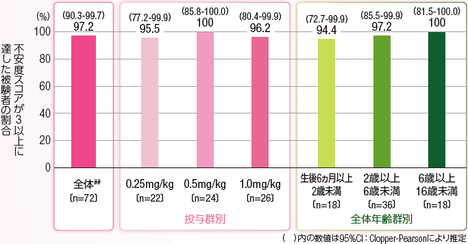 鎮静度スコアが3以上に達した被験者の割合及び割合の両側95%CIは、3投与群を併合した全被験者で97.2%(70/72例)(95%CI:90.3-99.7)であり、両側95%CIの下限値(90.3%)は治験実施計画書において有効割合の閾値として設定した65%を上回った(Clopper-Pearsonにより推定)。