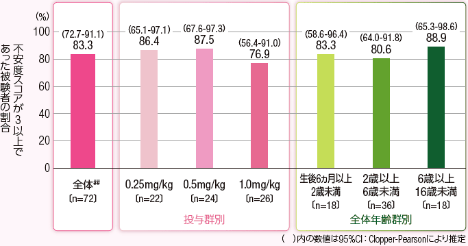 保護者との分離時における不安度スコアが3以上であった被験者の割合は上に記した図の通りであり、3投与群を併合した全被験者で83.3%(60/72例)であった。