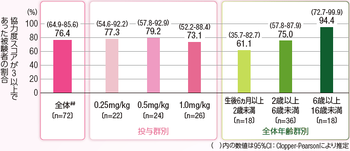 マスク導入時における協力度スコアが3以上であった被験者の割合は上に記した図の通りであり、3投与群を併合した全被験者で76.4%(55/72例)であった。
