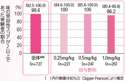味の受容性評価スコアが2以上であった被験者の割合は3投与群を併合した全被験者で98.6%(71/72例)、投与群ごとでは、0.25mg/kg群、0.5mg/kg群、1.0mg/kg群でそれぞれ100%(22/22例)、100%(24/24例)、96.2%(25/26例)であり、いずれの投与群でも味の受容性は良好であった。