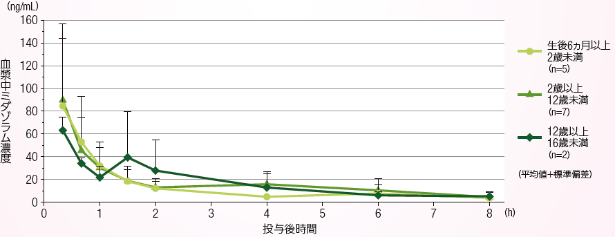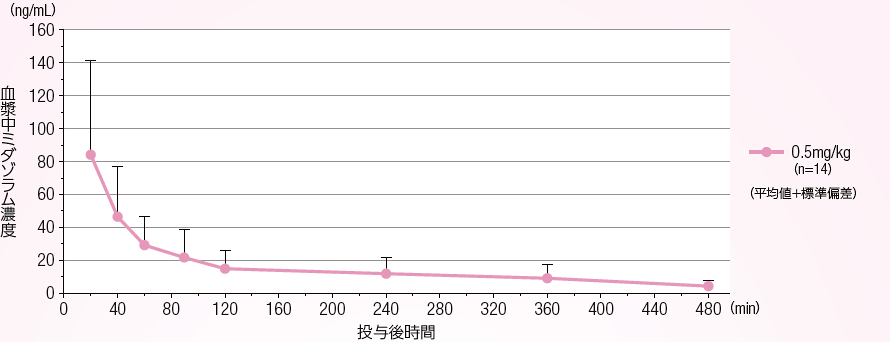 本剤単回経口投与後のミダゾラムの血漿中薬物濃度推移(平均値+標準偏差)は以下の通りであった。血漿中ミダゾラム濃度のTmax(中央値(最小-最大))は0.33(0.30-1.50)時間であった。また、T1/2(平均値±標準偏差)は2.13±0.84時間であり、速やかに効果が消失することが示唆された。