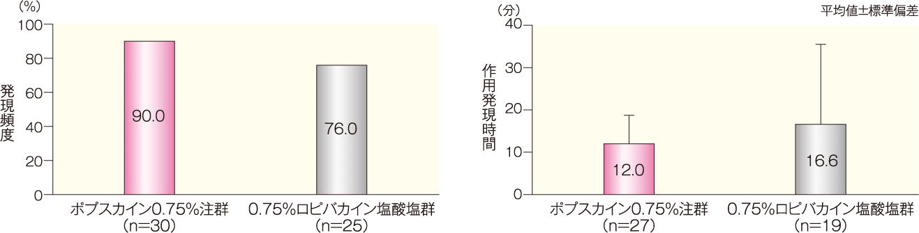 橈骨、正中、尺骨、筋皮、内側前腕皮及び内側上腕皮の6つの各神経支配領域の中で最も多く手術が施行された部位の正中神経領域において、痛覚消失効果の作用発現時間(平均値±標準偏差)は、ポプスカイン0.25%注群21.0±22.2分、0.25%ブピバカイン塩酸塩群25.2±29.4分であった。観察期間中に痛覚消失効果の作用発現が確認された症例について、内側上腕皮神経ではポプスカイン0.25%注群29例中14例(48.3%)、0.25%ブピバカイン塩酸塩群26例中14例(53.8%)であった。