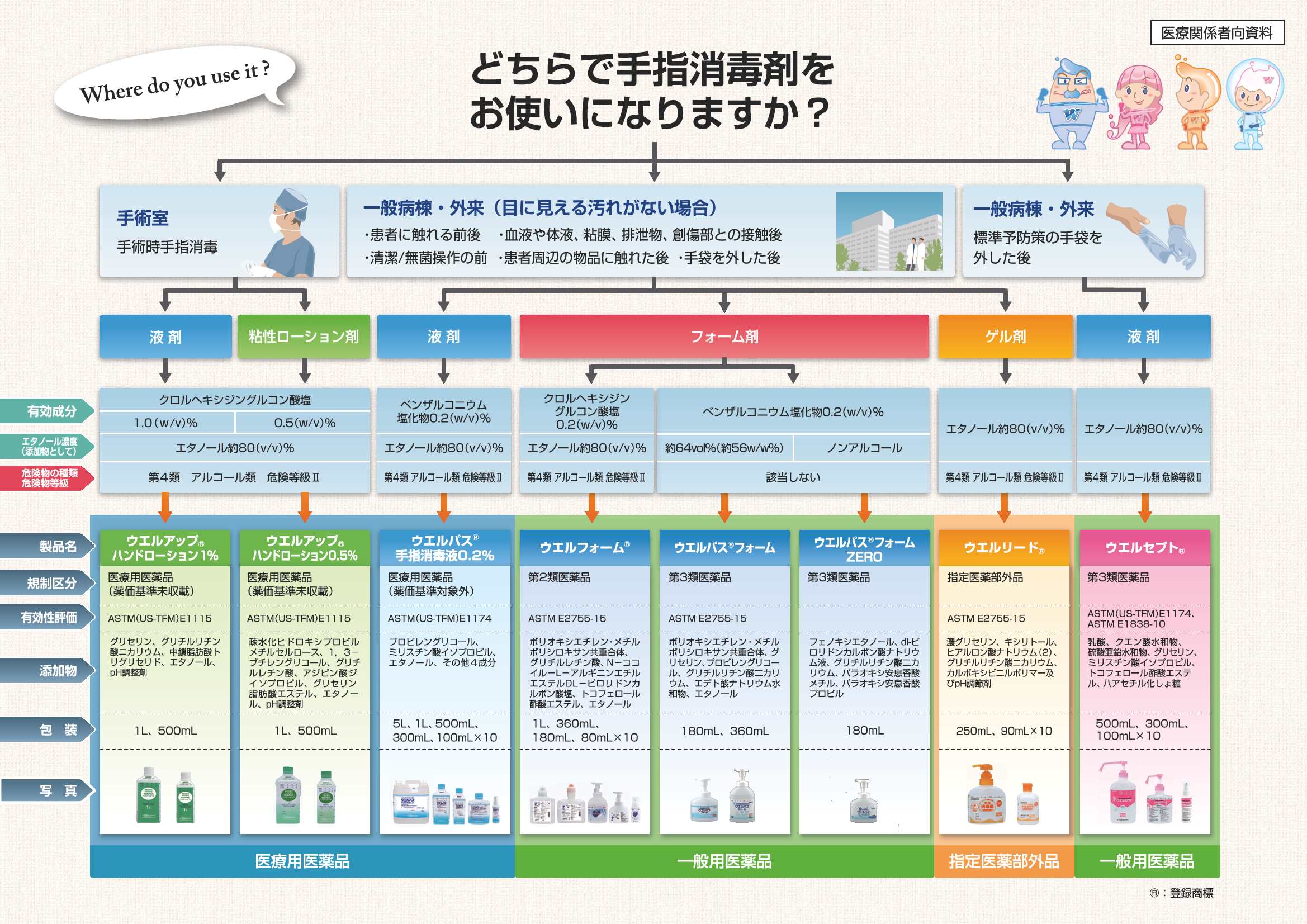 ウエルアップハンドローション0.5%は、クロルヘキシジングルコン酸塩0.5%を含有する粘性液剤の速乾性擦式手指消毒剤で、ウエルアップハンドローション1%は、クロルヘキシジングルコン酸塩1%を含有する液剤の速乾性擦式手指消毒剤で粘性はありません。エタノール濃度は共に約80vol%を含有します。